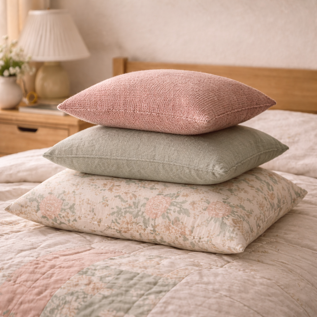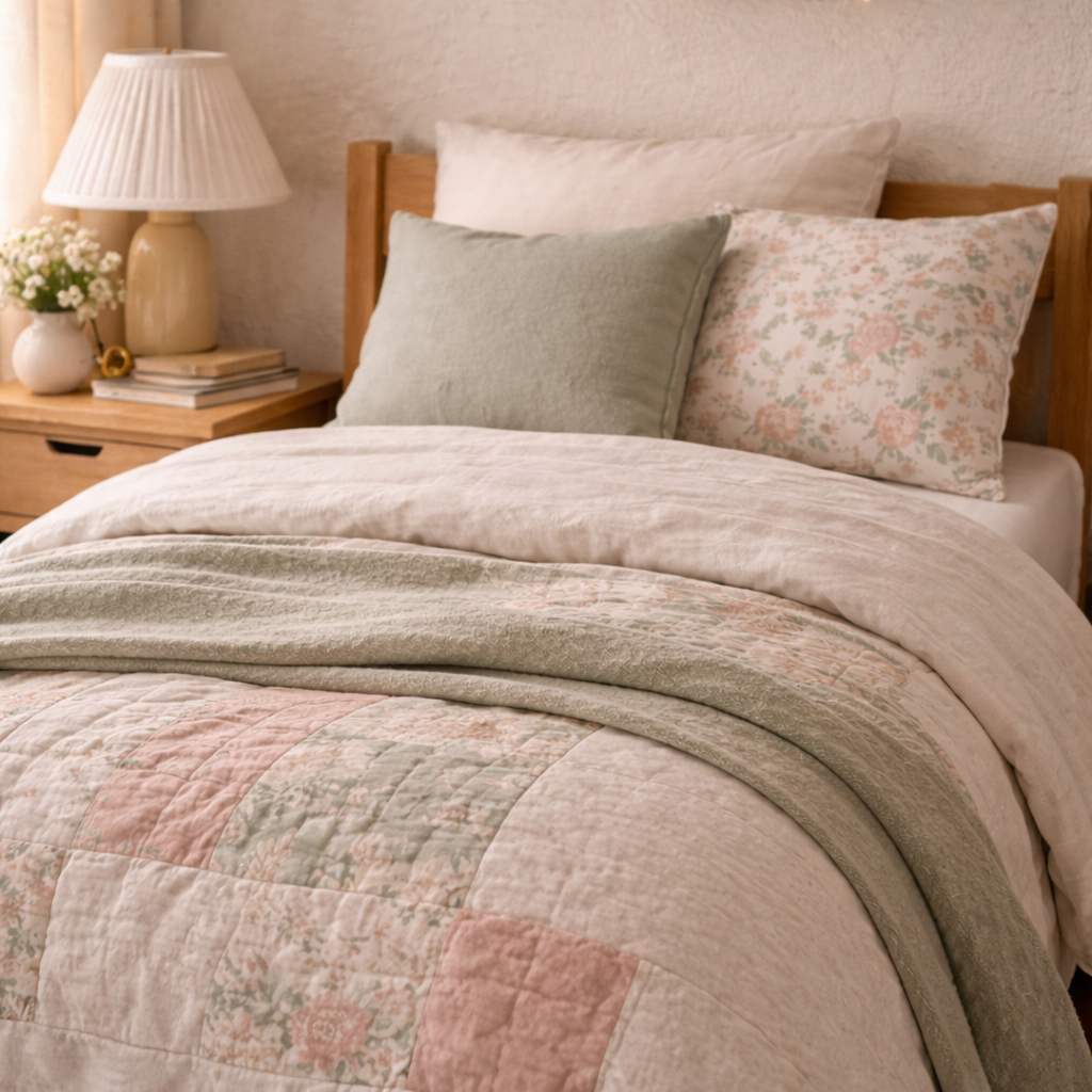 Soft, layered bedding in warm ivory and muted blush tones, with subtle pattern and texture that feels romantic, familiar, and quietly lived in.
