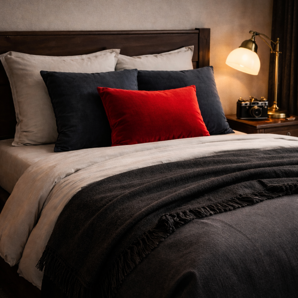 Layered contrast with controlled structure. Deep charcoals, warm neutrals, and precise hits of red create a bed that feels composed, intentional, and complete.