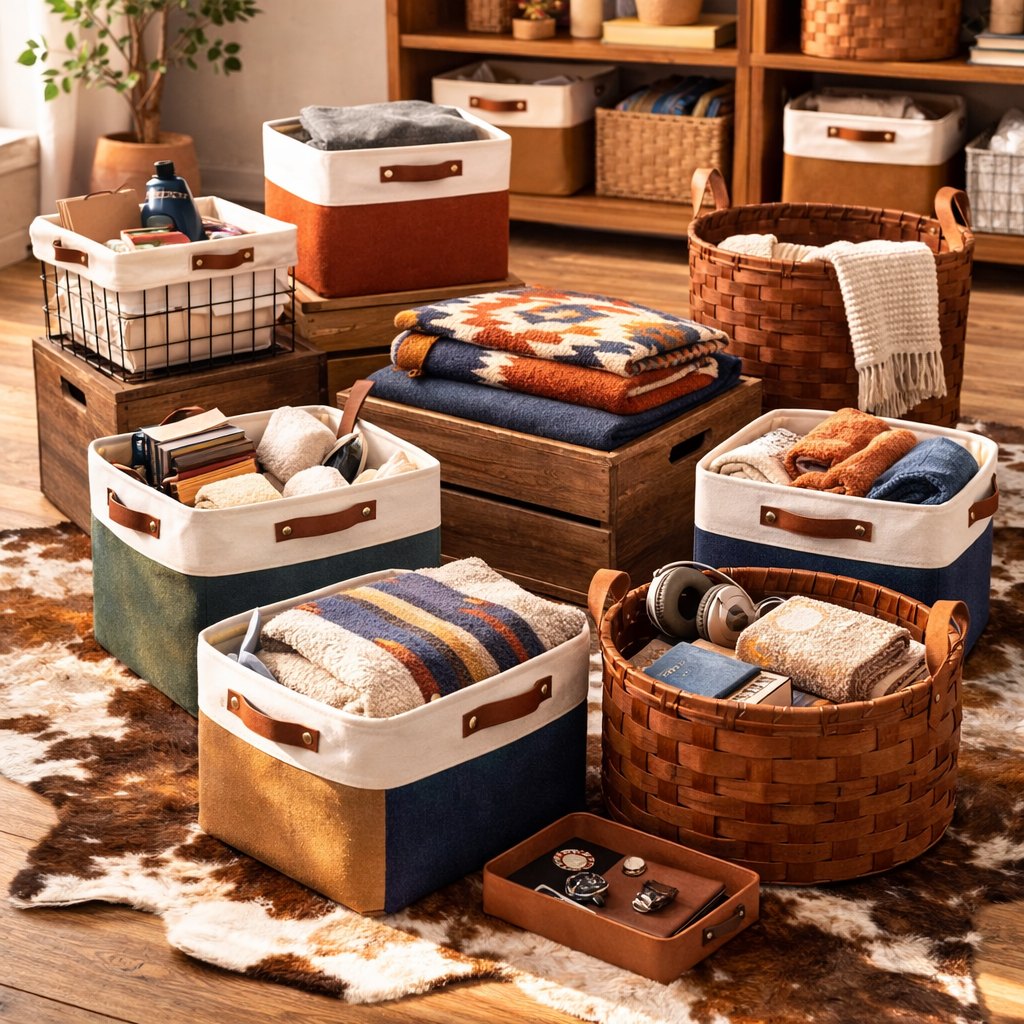 Wood crates, galvanized metal bins, leather trays