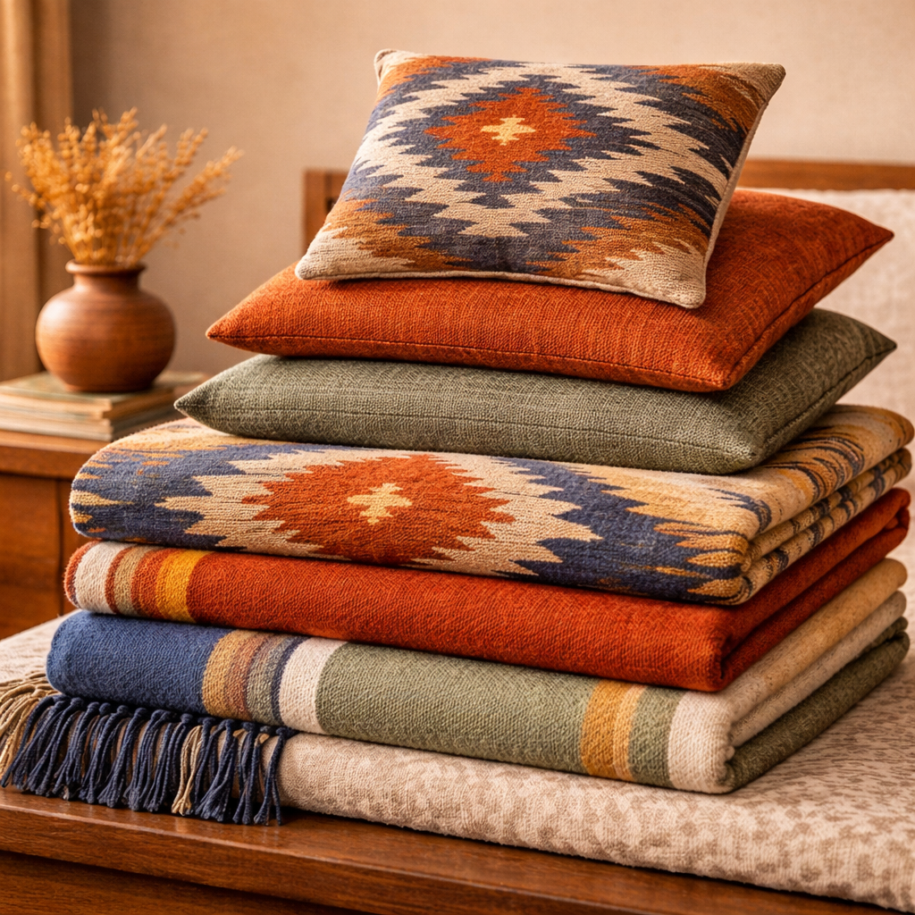 Layered warmth with rugged structure. Earth tones, tactile textiles and bold geometric patterns create a bed that feels grounded and complete.